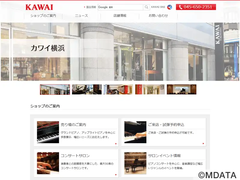 1960年に開業した歴史あるカワイ横浜店。2016年に桜木町駅近くの場所に移転し、準旗艦店としてリニューアル。ショールームでは、最高級グランドピアノ「Shigeru Kawai」からデジタルピアノまで試弾が可能で、充実した楽譜コーナーや音楽教室も設けられている。音楽イベントのための50席のコンサートサロン「プラージュ」も併設されている。ホールレンタルも可能で、地域の様々な音楽活動をサポートしている。