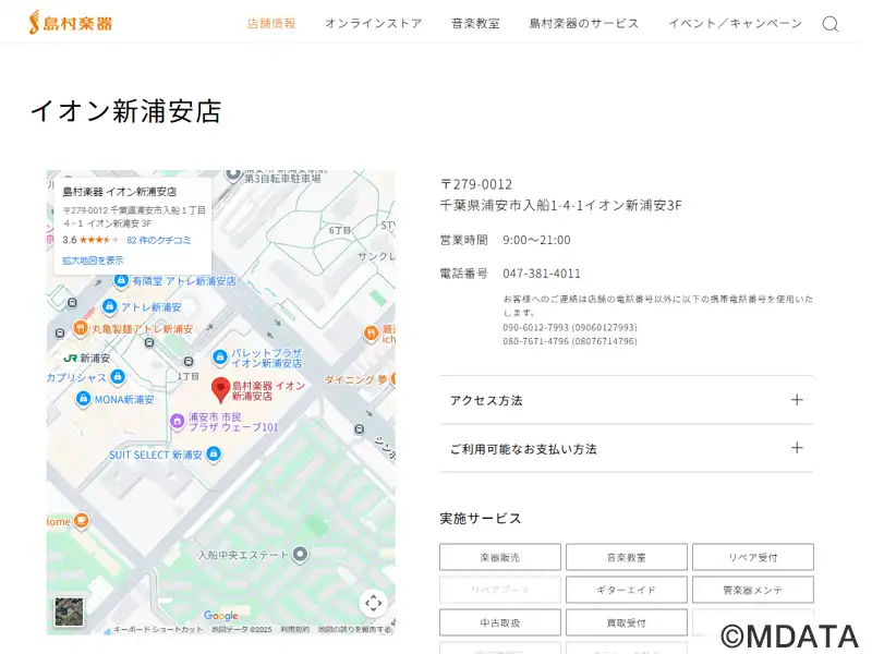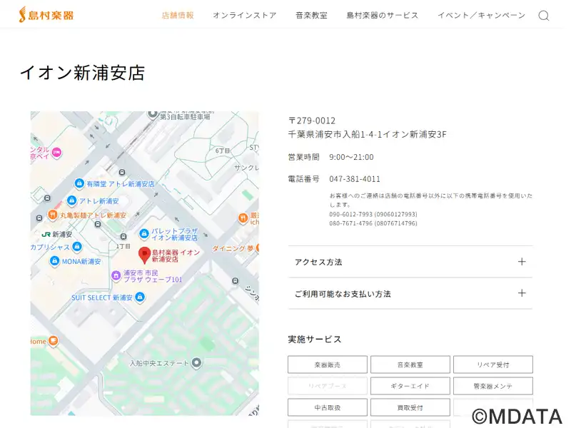 JR新浦安駅前のイオン新浦安ショッピングセンター3Fにある総合楽器店と音楽教室。19年11月まで2Fの店舗区画で営業、20年5月フロア移転リニューアル。ギター、電子ピアノ、電子ドラム、管弦楽器など幅広い楽器を取り揃え、さまざまなメーカーやモデルの商品を弾き比べることができる。音楽教室では16部屋のレッスンルームで約30種類のコースを開講。L部屋では初心者から参加できるサークルも開催している。