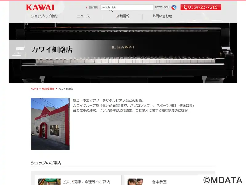 釧路市にあるKAWAI直営の楽器店。新品・中古のピアノやデジタルピアノの販売、ピアノの調律、修理、音楽教室の運営を行う。また、カワイグループの防音室、パソコンソフト、スポーツ用品、健康器具などの商品も取り扱っており、音楽教室の運営や楽器購入に関する積立制度の提案も行っている。音楽教室では、ピアノ、ドラマトーン、ボーカル、フルートなどのコースを開講していて、初心者から大人まで楽しくレッスンを受講できる。