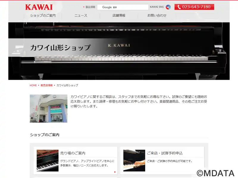 山形駅西口近くにあるKAWAI直営の楽器店。アップライトピアノ、中古ピアノ、電子ピアノ、電子オルガンなど多数展示。試弾も可能で、調律・修理にも対応。楽譜も豊富に取り揃えている。併設するカワイ音楽教室「山形センター」では、子供向けのピアノ、ソルフェージュなど、年齢に合わせたカリキュラムで、子供たちの可能性を大きく伸ばす。大人向けには初心者でも演奏の楽しさを実感できるピアノなどのコースを開講している。