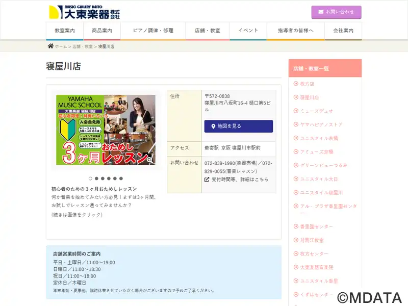 大阪府寝屋川市の香里園駅から徒歩約8分の場所にある総合楽器店。ギター、ウクレレ、サックス、フルート、電子ピアノなど、幅広い種類の楽器を取り扱っている。初心者からプロフ向けまであらゆるレベルに対応し、アフターサービスも提供する。また、ヤマハ大人のための音楽教室や、大東楽器オリジナルレッスンなどを開講。ギター、サックス、バイオリンなど様々なコースを用意し、全ての世代の方々に音楽の楽しみを提供している。