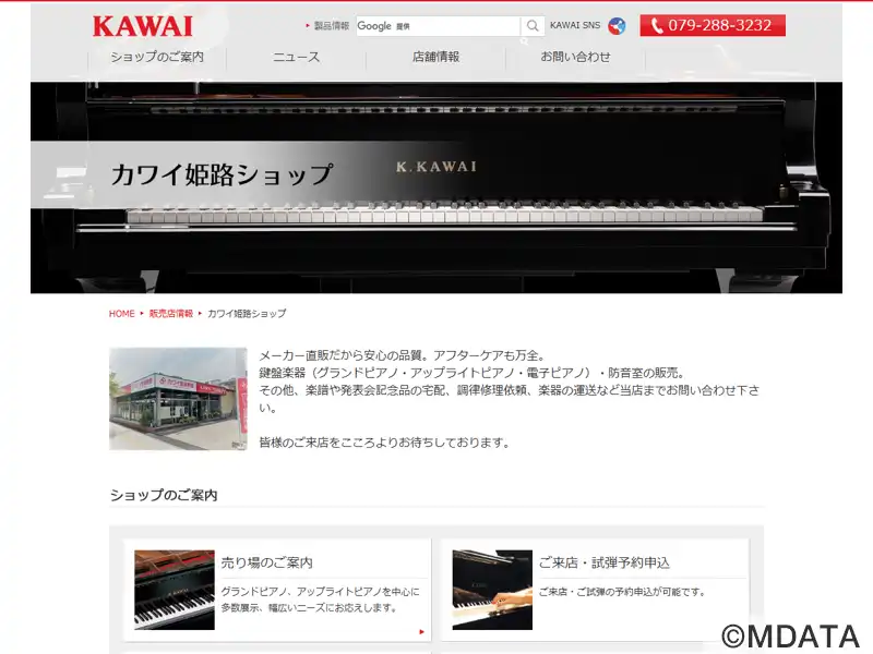 姫路市にあるKAWAIの直営の楽器店。グランドピアノから電子ピアノ、特選中古ピアノなど多数の商品を展示、試弾も可能でお気に入りの一台を提案する。で調律、修理などアフターケアも万全。消音ユニットや防音室も取り扱い、楽譜の郵送サービスもある。音楽教室では、幼児グループレッスン、ピアノ、フルート、ドラム、電子オルガンなど個人レッスンも充実している。ピアノの練習室のレンタルも利用可能。専用駐車場6台あり。
