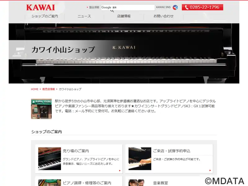 小山市元須賀神社参道沿いにあるKAWAI直営の楽器店。アップライトピアノを中心に、電子ピアノや楽譜やアクセサリーを展示販売。併設するカワイ音楽教室「小山センター」では、子供向けのピアノ、ドリマトーン、バイオリン、サックス、チェロなど、年齢に合わせたカリキュラムで、子供たちの可能性を大きく伸ばす。大人向けにはピアノ、バイオリン、サックス、ギター、オカリナ、大正琴、チェロなど多数のコースを開講している。