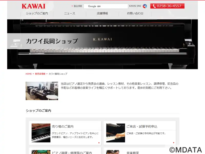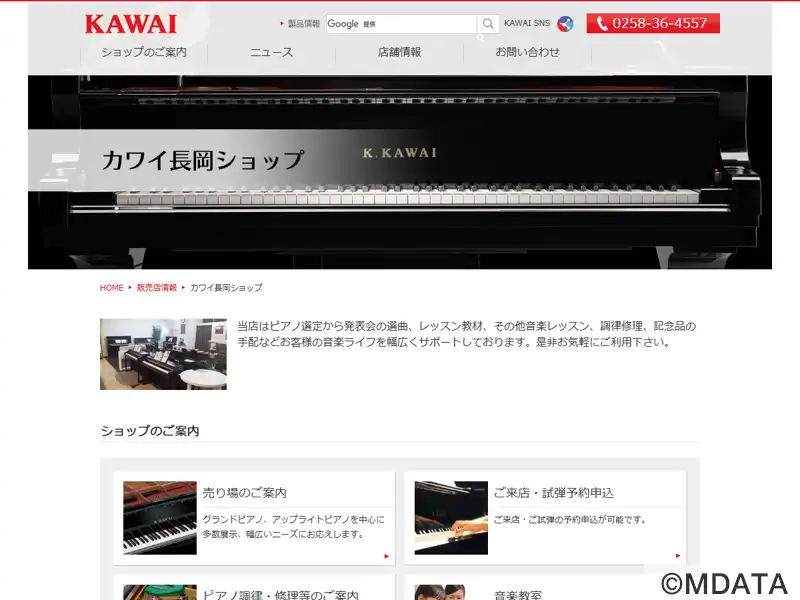 長岡市にあるKAWAI直営の楽器店。ピアノの選定から発表会の選曲、音楽レッスン、調律・修理、記念品の手配など音楽ライフを幅広くサポートする。店内には、グランドピアノから電子ピアノ、工場でメンテナンス済みの中古ピアノまで、人気のモデルが多数展示され、試弾も可能。また、消音キット「AK-01」も取り扱っており、現在使用中のピアノに取り付けを希望するご相談も可能。ピアノ練習室のレンタルもOK。