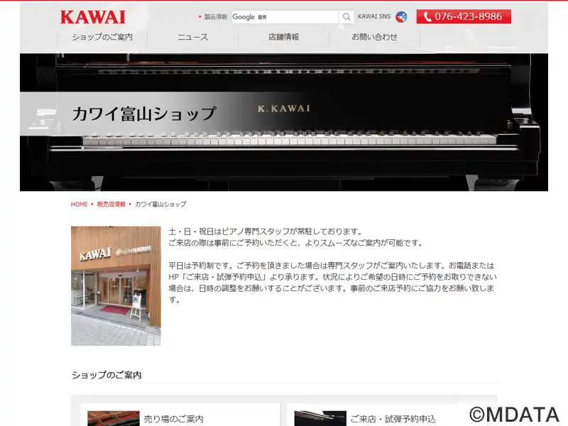 富山市にあるKAWAI直営の楽器店。店内にはグランドピアノから電子ピアノ、中古の再生ピアノ、防音室などの商品を展示、販売を行っている。試弾もOKで、調律や修理も依頼できる。楽譜も宅配サービスを行う。音楽教室では子どもから大人まで多彩なコースを用意しており、ピアノ練習室のレンタルもOK。店舗は市電「西町停留所」のすぐ近く。