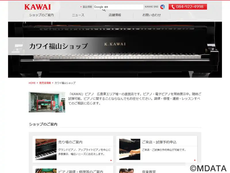 福山市にあるKAWAI直営の楽器店。人気の木目ピアノや音とタッチを追求した最上級クラスの電子ピアノなどが多数展示・販売。調律、修理などアフターケアにも対応。併設するカワイ音楽教室「福山センター」では、子供向けのソルフェージュ、ピアノ、ドリマトーン、ドラムなど、年齢に合わせたカリキュラムで、子供たちの可能性を大きく伸ばす。大人向けには初心者でも演奏の楽しさを実感できる、多くのコースを開講している。
