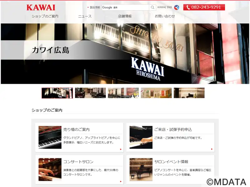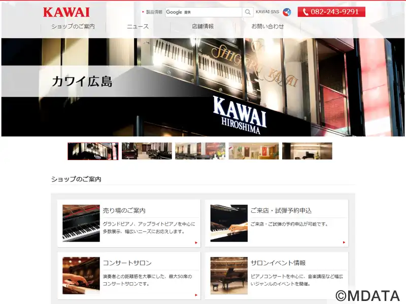 広島市紙屋町・鯉城通りに、2015年7月にオープンしたカワイ直営の大型ピアノ専門ショップ。ショールームには、最高峰グランドピアノ「Shigeru Kawai」をはじめ、カワイピアノが多数展示、試弾も可能。楽譜や音楽雑貨も豊富に取り揃える。約50席のミュージックサロン「パーチェ」を併設し、若手演奏家によるピアノコンサート、発表会、音楽セミナーが開催されている。「カワイミュージックスクール広島」も開講。
