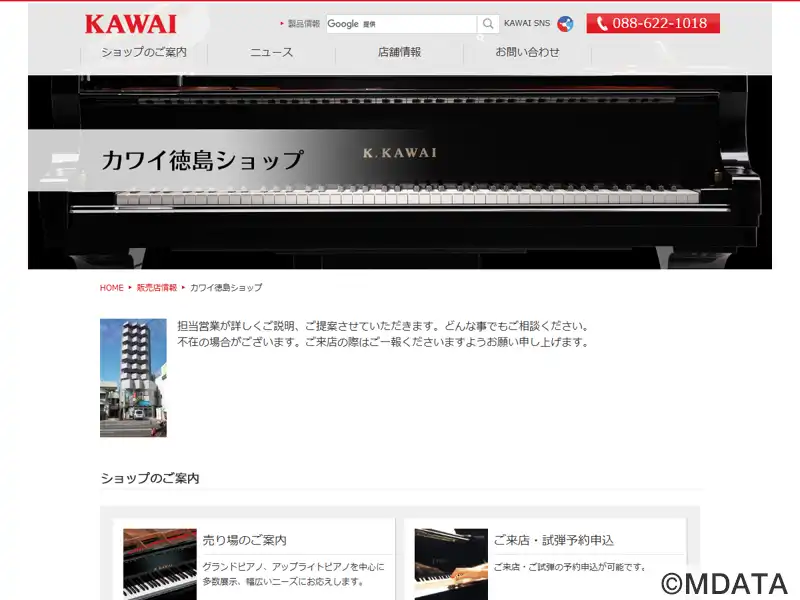 徳島市にあるKAWAI直営の楽器店。グランドピアノ、アップライトピアノや電子ピアノを多数展示・販売。試弾も可能で、調律・修理や防音室の設置にも対応する。併設するカワイ音楽教室「佐古センター」では、子供向けのピアノ、ソルフェージュ、フルートなど、年齢に合わせたカリキュラムで、子供たちの可能性を大きく伸ばす。大人向けには初心者でも演奏の楽しさを実感できるピアノ、フルートなどのコースを開講している。