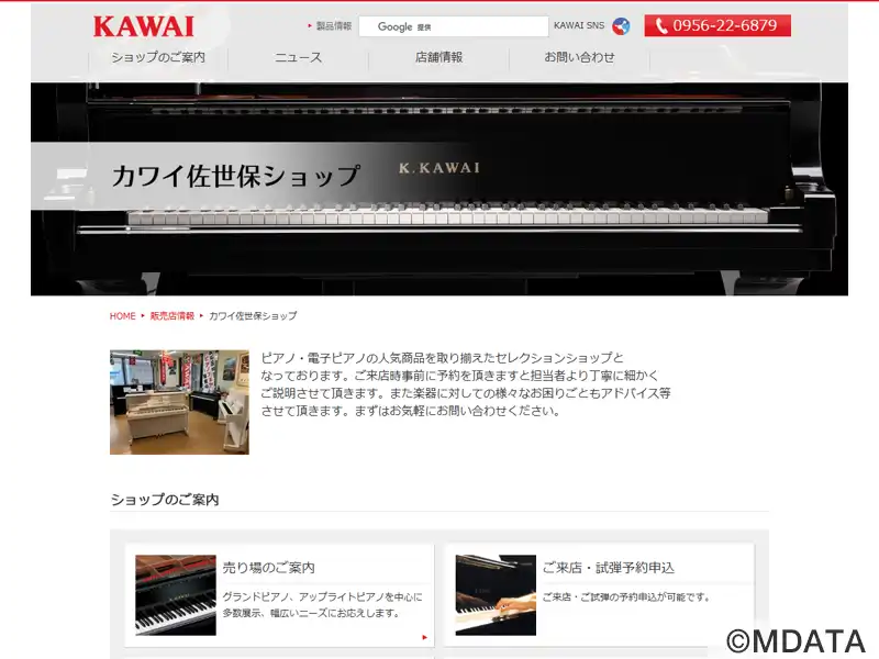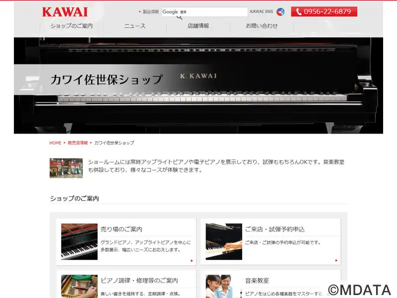 佐世保三ヶ町サンプラザアーケードにあるKAWAI直営の楽器店。ショールームにピアノや電子ピアノを常時展示、試弾も可能。調律・修理も行う。音楽教室ではピアノ、ドリマトーン、ボーカル、バイオリン、オカリナ、ドラムのコースから、グループリトミック、大人向けのデイタイムピアノレッスンなど、子どもから大人まで、様々なコースを開講。ピアノ練習室のレンタルも行う。島瀬公園前バス停から徒歩3分。