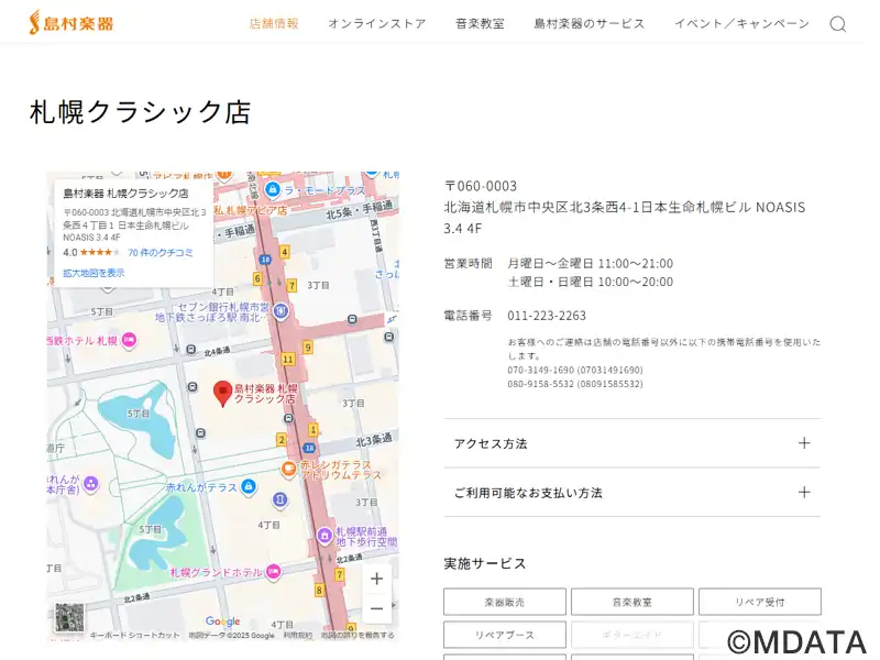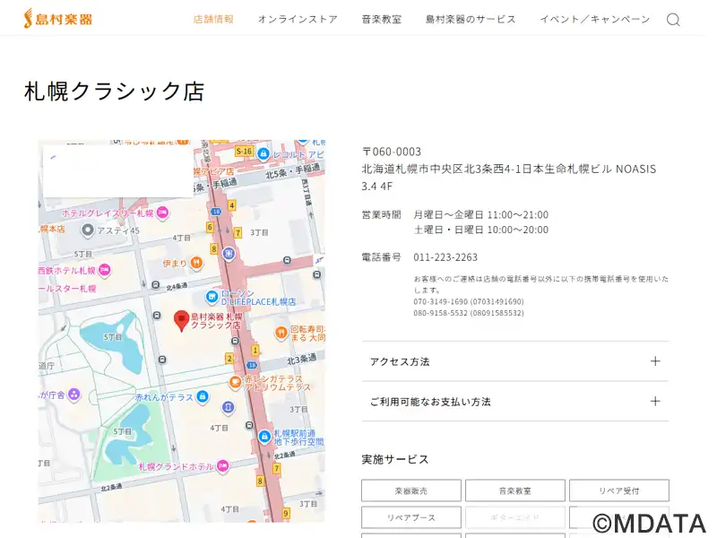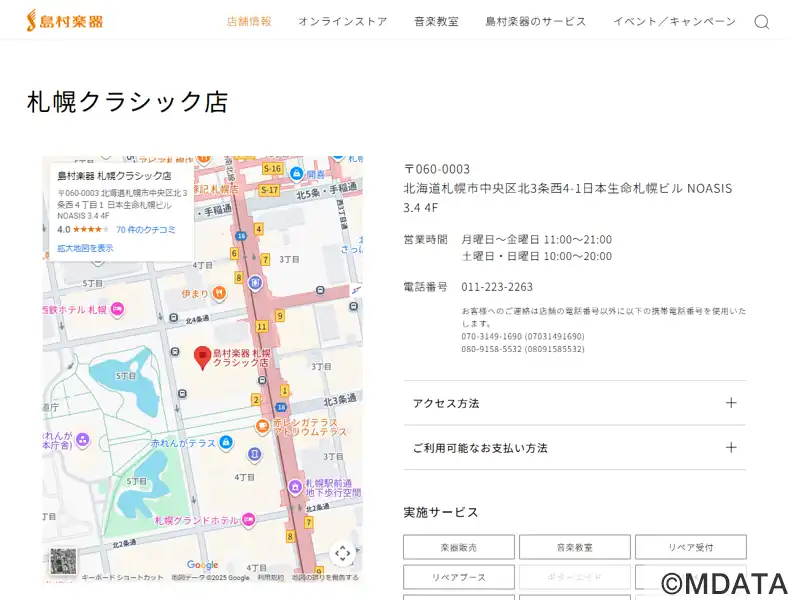 札幌駅と地下通路直結で、雨の日でも傘をささずに行ける島村楽器、北海道エリア唯一のクラシック専門店。店内には、グランドピアノから管楽器、弦楽器、輸入スコアなど充実した商品が、落ち着いた空間にラインナップされている。また、試奏室もあり、周りを気にせずに試奏することができる。ガラス張りの管・弦楽器リペアルームを併設し、修理や調整、毛替え、アフターケアも万全。音楽教室「島村楽器札幌クラシック店」も併設する。