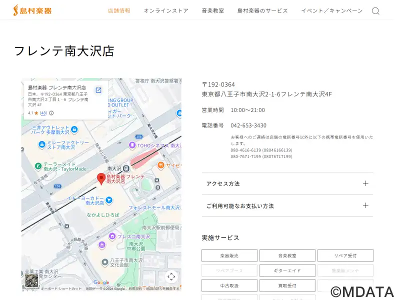 南大沢駅改札を出てすぐの「フレンテ南大沢」新館4Fに2009年オープンした総合楽器店。管楽器・弦楽器のショーケース展示は試奏も可能。各メーカーの弾き比べができる電子ピアノコーナー、エントリーモデルが充実したギター・ベースコーナー、楽譜、アクセサリーも豊富に取り揃えている。店内には10部屋のレッスンルームが併設され、バンド楽器からこども向けコース、管弦楽器など多彩なコースの音楽教室を開講している。