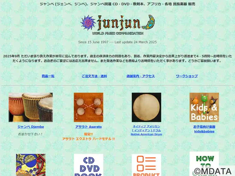 新潟市西蒲区にあるジャンベ・アフリカ民族楽器の専門店。ジャンベ(ジェンベ)、ドゥンドゥン、アサラト、バラフォン等のアフリカ民族楽器の販売や、オリジナルジャンベケース、ジャンベ用皮やロープ、専用工具の販売、張り替え修理に対応。また、口琴、ネイティブアメリカン(インディアン)ドラム、天然素材のお子様向け楽器、CD・DVDなども在庫。さらに、新潟各地でジャンベ・ドラムのワークショップも開催している。