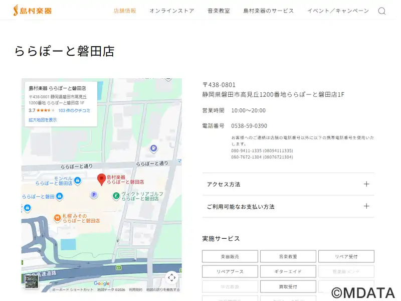 磐田市にある三井ショッピングパーク「ららぽーと磐田」1階に2009年オープンした総合楽器店。200坪の店内に、ピアノや管楽器、弦楽器、ギター、楽譜やアクセサリーを幅広く取り揃え、リペアスタッフが常駐する管楽器リペアブースを設置している。ギターの応急処置サービスもあり、楽器のメンテナンスも安心。併設する音楽教室では計9部屋のレッスンルームで多彩なコースを開講。JR磐田駅北口よりシャトルバス約20分。