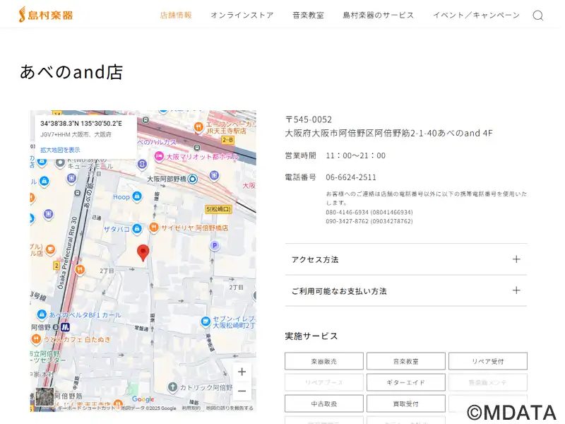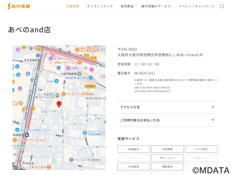 天王寺・阿倍野にあるファッションビル「あべのand」4Fに2018年9月オープンした楽器店。前身あべのキューズモール店(2011〜)、近鉄あべのハルカス店(2016〜)から移転。ギター・ベース、ウクレレ、電子ピアノ、管弦楽器、デジタル楽器、アクセサリーや楽譜まで幅広く取り揃えている。併設する音楽教室では、ピアノやドラム、ギター、バイオリン、フルート、サックスなど多彩なレッスンと予約制サロンを開講。