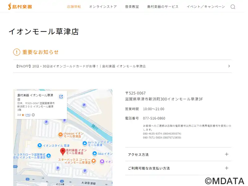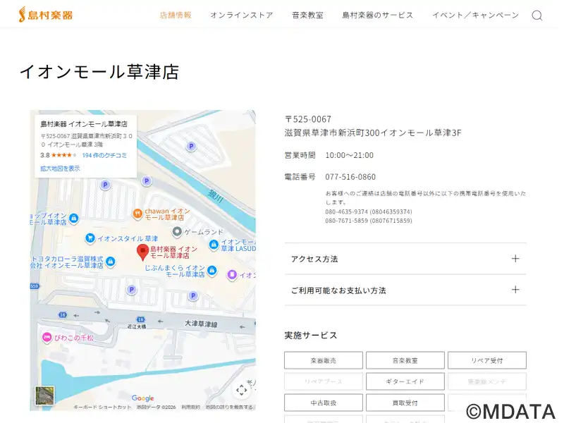 琵琶湖を望む、近江大橋のたもとに位置するショッピングモール「イオンモール草津」3Fに2008年オープンした総合楽器店。電子ピアノは主要5大メーカー約30台を展示。ギターやエフェクター、アンプの中古品も取り扱い、幅広い楽器と楽譜、アクセサリーを品揃え。多彩なコースの音楽教室を併設し、演奏を楽しむイベントも開催している。JR瀬田駅東口・南草津駅西口からバス約15分。モール駐車場約4,400台あり。