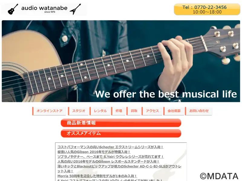 福井県敦賀市本町で1975年に創業した楽器とオーディオ販売の専門店。ギター、ベース、ウクレレ、キーボードなどの楽器本体や、アンプ、エフェクター、スコア、アクセサリー類まで幅広く取り扱う。音響機器のスピーカーやアンプなども扱い、家庭用から業務用まで取り揃える。レンタルスタジオを併設し、練習の場も提供する。楽器や機材の修理や調整、中古品の買い取り、機材レンタルも行い、オンラインショップも運営している。