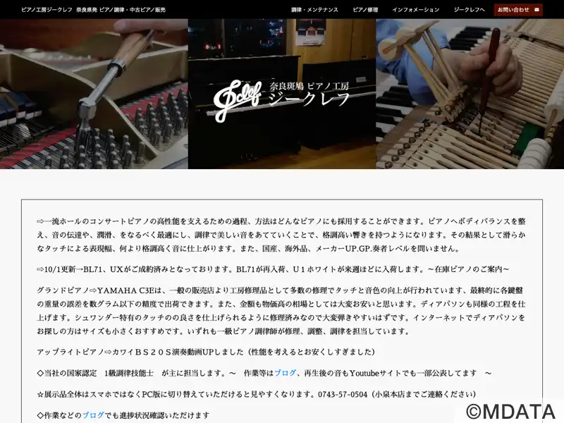 奈良市にある1985年に開業したピアノ工房。「斑鳩店」では、プロの技術で丁寧に修理・調整された、良質な中古ピアノを展示・販売している。音質・タッチを大切にし、一台一台の個性を引き出すピアノ調律・メンテナンスを行う。また、駅前の「小泉店」では、奈良フィルハーモニー管弦楽団監修教室として、団員や芸術協会講師がバックアップする音楽教室を開講。楽譜やレッスンに役立つアイテムや音楽雑貨も多数取り揃えている。