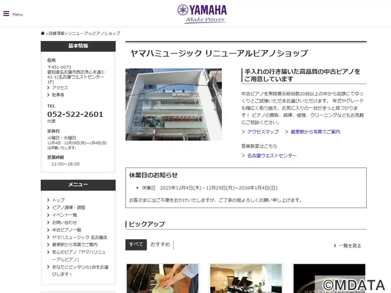 名古屋市西区にあるヤマハ直営の中古ピアノ専門店。高品質の中古グランドピアノ、アップライトピアノ、中古電子ピアノやエレクトーンなど多様な年式、モデル、グレードを展示販売。試弾も可能。調律、修理、消音ユニットの取付や買取にも対応。2・3階には音楽教室「名古屋ウエストセンター」があり、ヤマハ認定講師によるヤマハ音楽教室、大人のヤマハ音楽教室を開講。4階にサロンコンサートができる「ウエストホール」を併設す