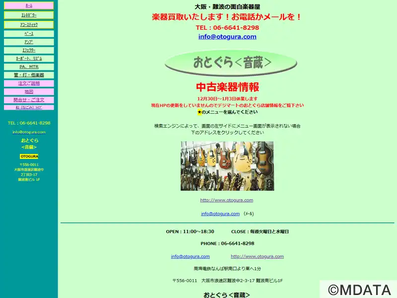 大阪ミナミのなんばの、中古やヴィンテージの楽器を中心に豊富な品揃えを誇る楽器店。30年以上の歴史を持つ老舗で、エレキギターからアコースティックギター、ベース、アンプを取り扱う。中古やヴィンテージ楽器は、店頭での確認が推奨している。また、楽器の買取りや下取りを積極的に行っていて、電話やメールでの見積もりにも対応。通販のサービスや出張買取り、発送による査定も提供し、演奏活動をしっかりとサポートしている。
