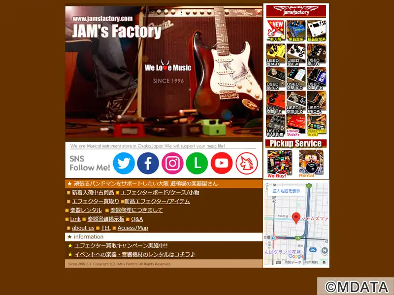 ジャムズファクトリーは1996年オープン以来、頑張るバンドマンをサポートする大阪・道頓堀のエフェクター・ギターショップ 。種類豊富なギターやベース、エフェクター、アンプ等の中古楽器、ギターパーツや楽器小物など販売。2Fにショップ試奏ルーム完備。イベント等に100種類以上の楽器・機材レンタルも行っています。