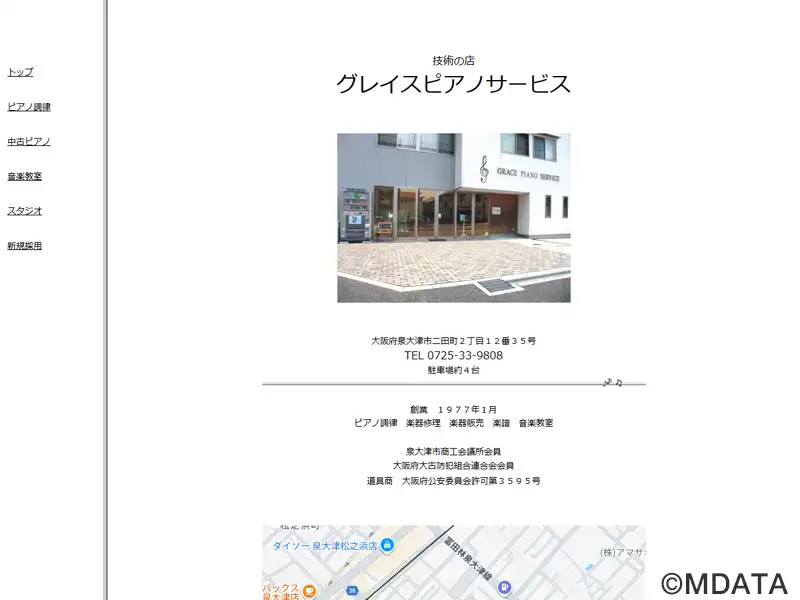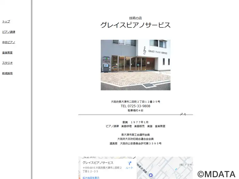 大阪泉大津市に位置する1977年創業のピアノ専門店。ピアノの調律・修理、中古ピアノの販売のほか、ディアパソンのグランドピアノを備えた音楽サロンと、グレイス音楽教室を併設している。サロンは30席のミニホールとしてレンタルも可能で、ピアノや弦楽器の練習スタジオ、少人数の発表会やクラシックコンサートに利用できる。またグレイス音楽教室として、ピアノ、大正琴、尺八の個人レッスンも開講している。駐車場4台あり。