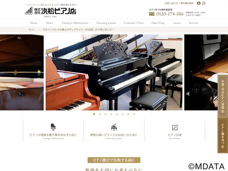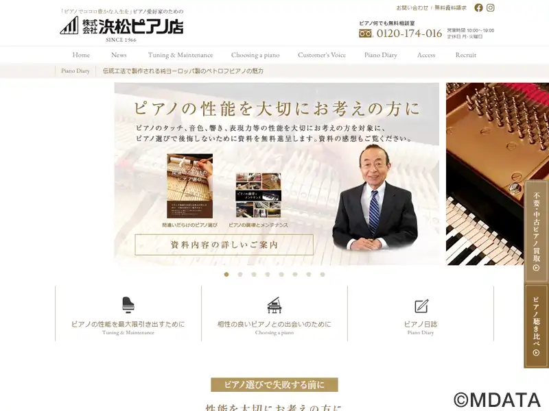 岡山市に1966年に創業したピアノ専門店。ショールームでは、老舗ヨーロッパブランドや純ヨーロッパ製ピアノ、国産中古ピアノまで、多くのピアノを試弾して比較することができる。3階には、グランドピアノ2台が設置された貸しホール(約20坪)があり、サロンコンサートや発表会、公開レッスン、練習などに利用可能。また、2階に3部屋のグランドピアノ練習室を設け、ピアノ教室とレッスン空き時間の貸練習室も行っている。