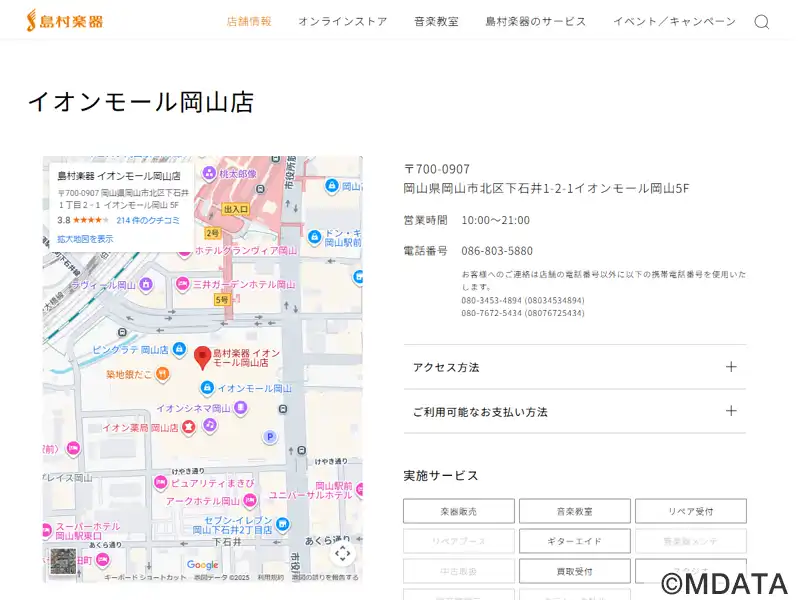 JR岡山駅から地下道で直結の都市型ショッピングセンター「イオンモール岡山」5Fにある総合楽器店。LM楽器からクラシック系楽器まで幅広い商品を取り揃え、メンテナンスなどアフターサポートも万全。店内には、子どもから大人まで楽しくレッスンできる音楽教室とレンタルスタジオを設けている。旧岡山OPA店から始まり、表町の旧岡山ロッツ店を経て、2014年12月駅前のイオンモールに移転リニューアルオープンした。