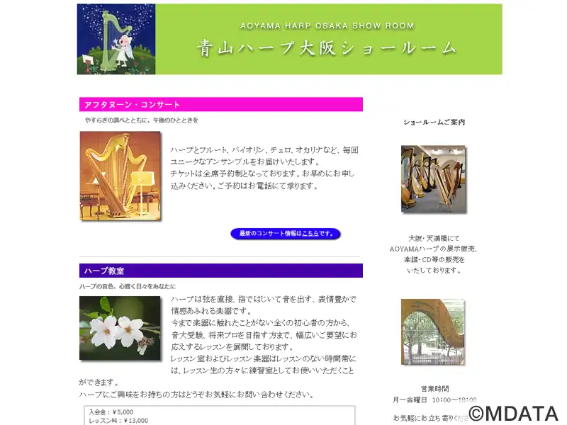 大阪・天満橋にある青山ハープ大阪ショールームでは、グランドハープ、アイリッシュハープ、サウルハープなどの展示販売を行なっています。ハープ関連の楽譜・楽書・CDも取り揃えています。ハープ教室では全くの初心者から、音大受験、将来プロを目指す方まで、幅広い要望に対応するレッスンを展開。お手頃な料金で一流の演奏がお楽しみいただけるアフタヌーン・コンサートも開催。