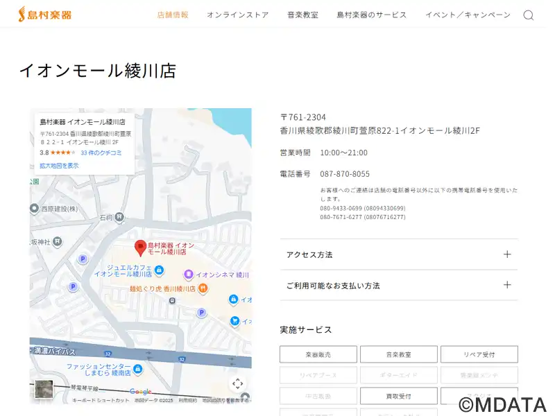 綾歌郡綾川町のショッピングセンター「イオンモール綾川」2Fにある楽器店。イオン綾川SC開業とともに2008年オープン。ギター、電子ピアノ、管弦楽器、音楽書籍、アクセサリーなど幅広い商品を揃え、バンドや個人練習ができるレンタルスタジオ、初心者から経験者まで幅広い年齢層の方が楽しめる音楽教室を併設。『音楽を楽しむ人を一人でも多く創る』という理念のもと接客サービスを展開。ことでん綾川駅から北へ徒歩3分。