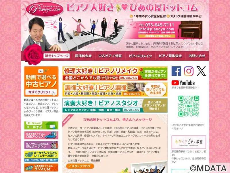 京都伏見の調律師が運営するピアノ調律・修理・中古ピアノ販売専門店。1995年に、ピアノ調律修理・ピアノ買取・中古ピアノ販売会社としてはじまり、全国に向けて「動画で選べる」中古ピアノ、オリジナル防音室コロラトゥーラの販売やピアノ買取、メンテナンス、ナイトーン・消音ユニット・グランフィール等の取付を行なっています。代表はFM845パーソナリティ。
