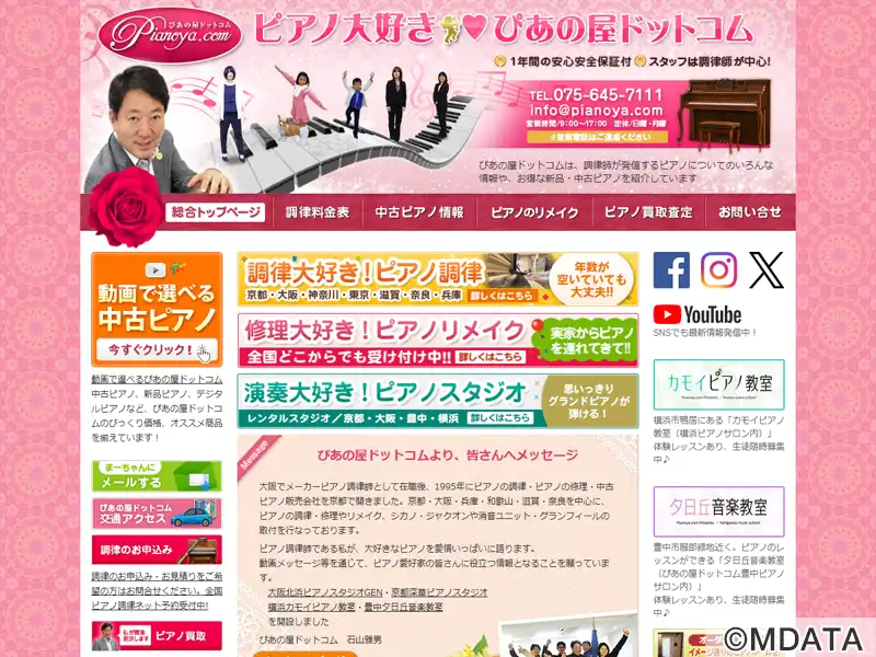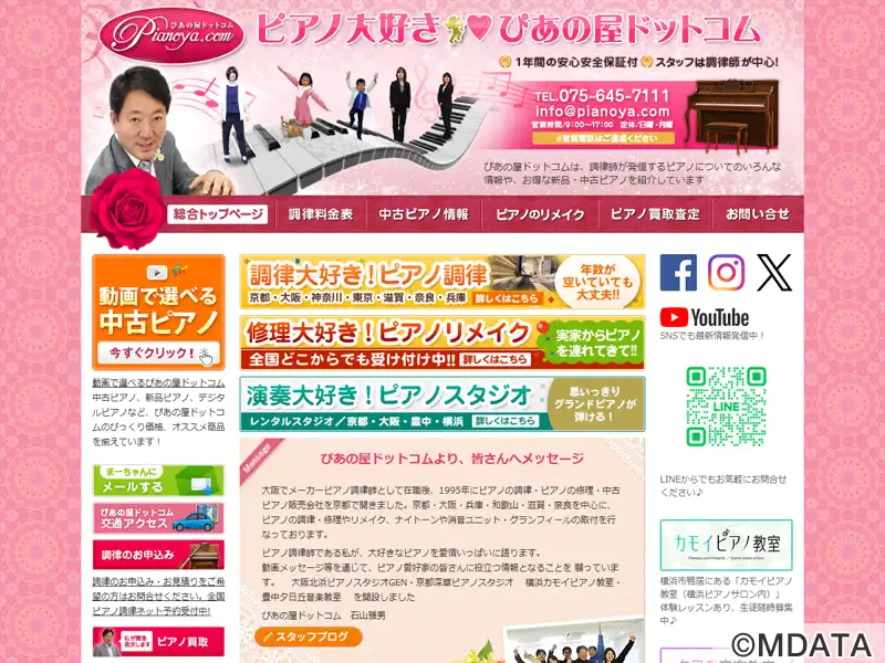 京都伏見を拠点とするピアノ専門店。1995年に調律・修理・中古販売を中心に創業し、調律師が整備した中古ピアノを動画で確認できる仕組みを提供している。サイレント機能や弱音装置、グランフィールなど多様な機能追加に対応し、防音室の製作やリメイク、査定業務も扱う。各地の提携調律師と連携し、教室やスタジオ運営を含む幅広いサービスを展開している。社団法人日本ピアノ調律師協会、国際ピアノ製造技師調律師協会会員。