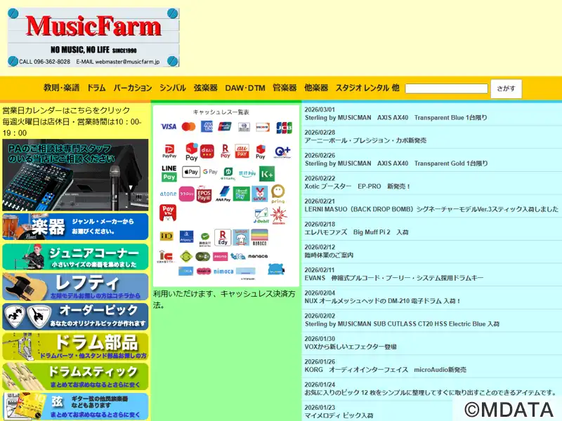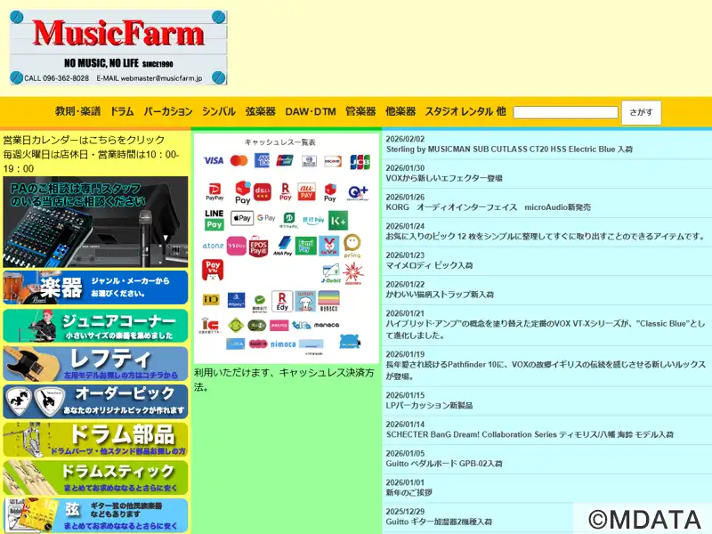 熊本市にある、1990年に創業した総合楽器店。フェンダーやマーチン、ギブソンなどのギターやベースをはじめ、エフェクターやドラム、パーツ、DAW関連商品などのコーナーも充実。また、弦やスティックなどのアクセサリーも豊富に取り扱う。バンド練習やレコーディングのレンタルスタジオも2部屋あり。各楽器の音が聴きやすい、響特性を考慮した設計。音の分離にも優れ、適度な臨場感を残しながらクリアな音質で録音が可能。