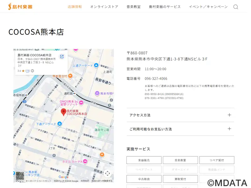 通町筋駅より徒歩2分、熊本・下通アーケードのCOCOSA 3Fにある総合楽器店。2020年4月に熊本パルコ店での約28年間の思い出とともに移転リニューアルオープン。ギターやウクレレ、電子ピアノ、管楽器、デジタル楽器、楽譜やアクセサリーを品揃え。店内に併設するミュージックスクールでは、ピアノやサックス、ボーカル、ギター、ドラムなどキッズからシニアまで楽しめる計14コースのレッスンを開講している。