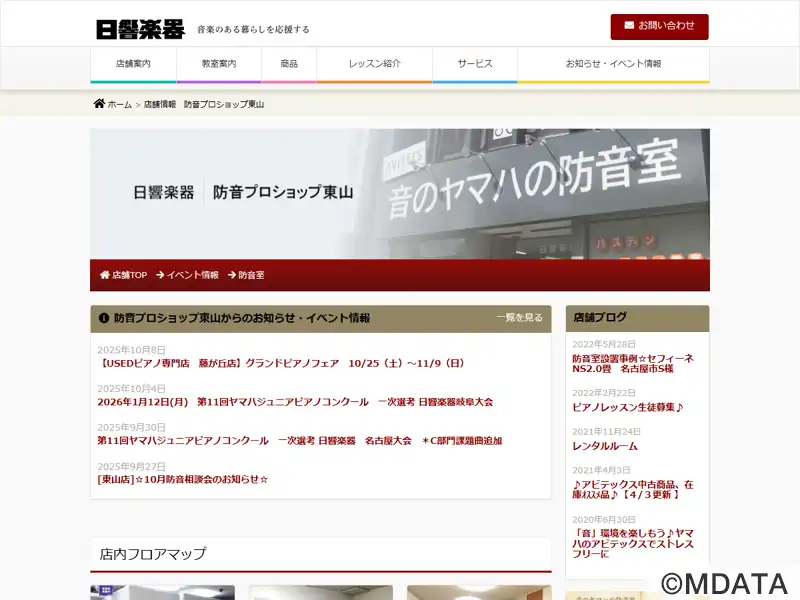 名古屋市千種区の東山公園駅徒歩1分の、防音・リフォームに特化した日響楽器の東山店。グランドピアノC2Lの入った防音室(Dr40のセフィーネII)を設置。管楽器や弦楽器を持ち込んで、実際に防音室の効果を試すこともできる。全室にグランドピアノを備えたピアノ教室を開講しており、日響楽器オリジナルレッスンのほか、ピアノやバスティンクループレッスンも行っていり。2台のピアノを設置した練習室のレンタルも可能。