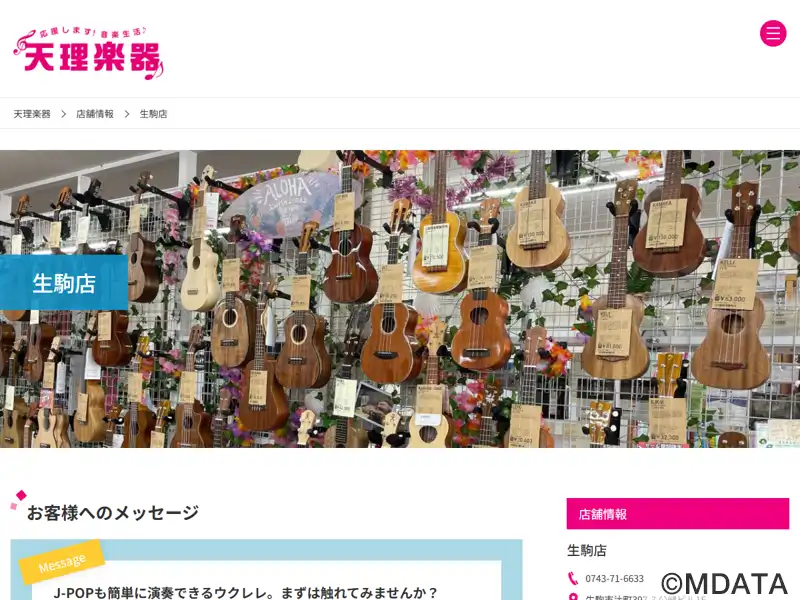 近鉄東生駒駅から徒歩5分にある株式会社天理楽器の生駒店。アコースティックギターとウクレレを中心に、ベース、アンプ、エフェクター、管楽器、電子ピアノ、電子ドラム、ハーモニカ、リコーダー、鍵盤ハーモニカ、楽譜など豊富に展示販売。リペアマンも常駐しているので、修理やメンテナンスも対応可能。また、LM楽器や管楽器など多彩なコースと経験豊かな講師陣によるレッスンを開講している。専用駐車場あり。