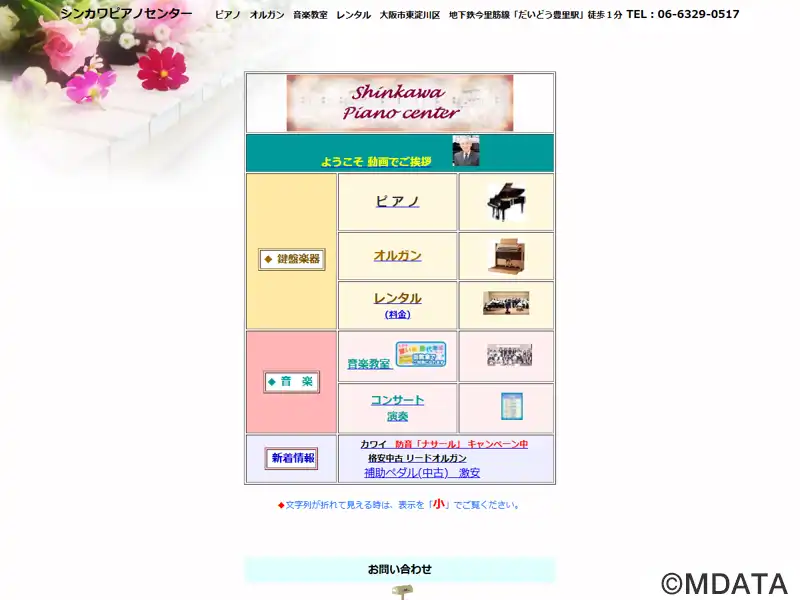 大阪市地下鉄だいどう豊里駅近くの鍵盤楽器専門。1971年創業以来、ピアノやクラシックオルガン、リードオルガンの販売・修理・レンタルを手がけており、ピアノ消音ユニットの取付や調律も行う。クラシックオルガンのレンタルは、パイプサウンド型と足踏み式リードオルガンの2種類に対応。音楽教室ではピアノ、オルガン、声楽の各科を設け、クラシックからジャズまで幅広い分野に対応したレッスンを実施。定期的に発表会も開催。