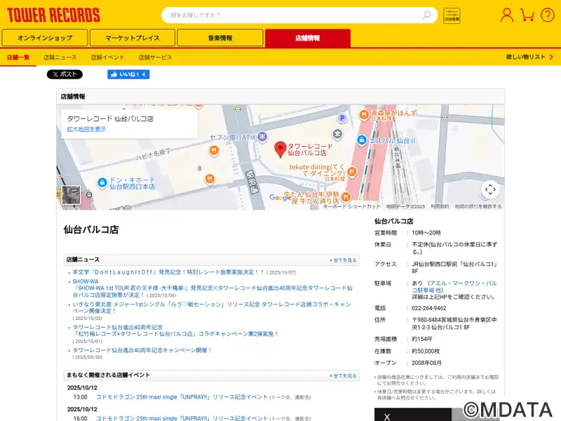 仙台市青葉区のJR仙台駅西口からペデストリアンデッキ直結のファッションビル、仙台パルコ8階に2008年8月にオープンした大型CDショップ。320坪の売り場に約100,000枚のアイテムを取り揃えている。国内で4店舗目、東北初の開業で、タワーレコードで初めてファッションビルテナントに入った履歴がある。2008年8月、現在地に移転リニューアルした。店内イベントスペースではミニライブや握手会が開催される。