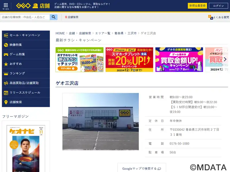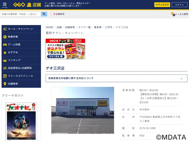 青森県三沢市にあるレンタル・販売・買取を行うアミューズメント・メディアショップ。DVD・ブルーレイのレンタル販売買取、CD、コミックのレンタル、新品・中古ゲームの販売買取、トレーディングカードの販売、スマートフォンやAV機器、家電アクセサリーも取扱う。新作・準新作も格安でレンタル。店内には幅広いジャンルのアミューズメントソフトが揃い、キッズからシニア層まで、幅広い世代のニーズに対応する。駐車場56台あり。