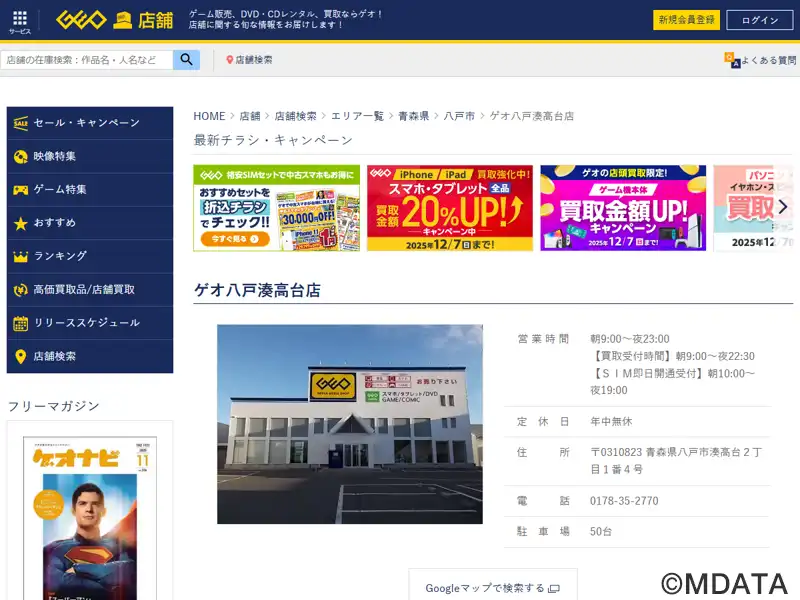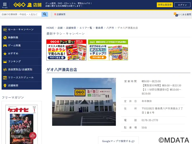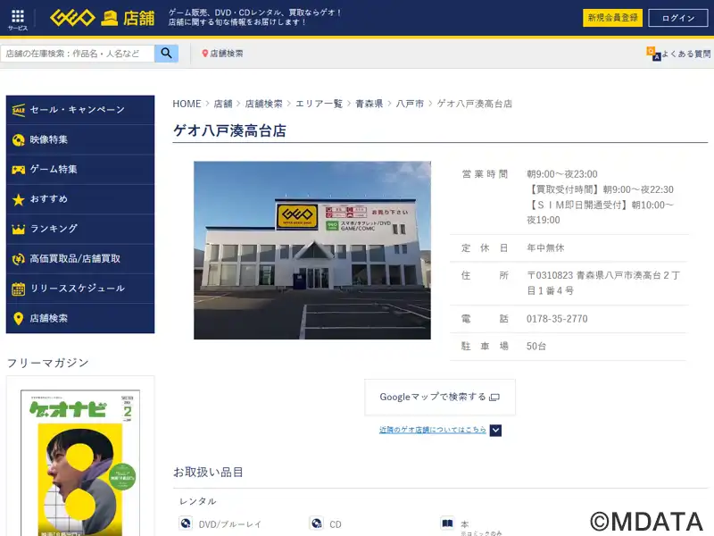 青森県八戸市にあるレンタル・販売・買取を行うアミューズメント・メディアショップ。DVD・ブルーレイ、CDのレンタル販売、コミックのレンタル、新品・中古ゲームの販売買取、中古パソコンの販売買取、トレーディングカードの販売、スマートフォンやAV機器、家電アクセサリーも取扱う。どこよりも安くをモットーに格安レンタル、販売を行う。大地(=ゲオ)のように、地域に根ざしたエンタメを提供する。駐車場50台あり。