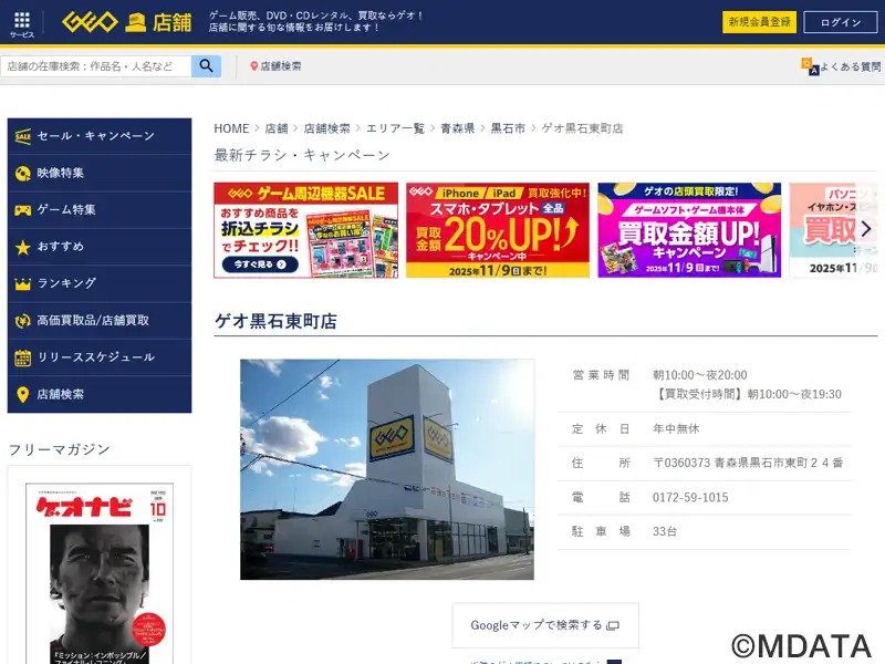青森県黒石市にあるレンタル・販売・買取を行うアミューズメント・メディアショップ。DVD・ブルーレイのレンタル販売買取、CDのレンタル、コミックの販売買取、ゲームの販売買取、トレーディングカードの販売、スマートフォンやAV機器、家電アクセサリーも取扱う。どこよりも安くをモットーに、大地(GEO)のようにアミューズメント分野にしっかり根ざし、気軽に楽しめるエンターテインメントの提供を掲げる。駐車場35台。