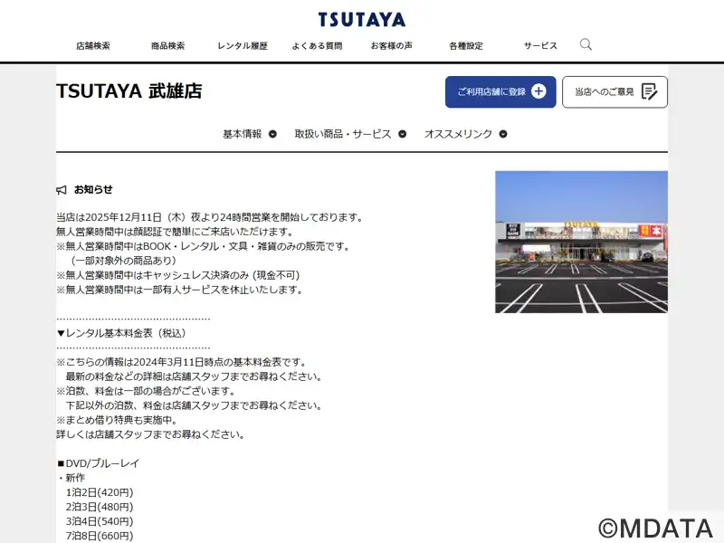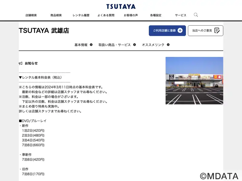 2021年11月12日リニューアル。県道24号線沿いのTSUTAYA 武雄店はレンタル、本・コミック、セルCD・DVD、ゲーム、リサイクル、欲しいものが一度に揃うまちのエンタメ情報発信基地。最新CD、洋画・邦画・韓流・アニメなど話題のDVDなど幅広い年齢層のニーズに合わせた豊富な品揃え。ゲーム・本・DVD・CDの高価買取。便利な郵便返却サービス受付中。駐車場約1,000台。