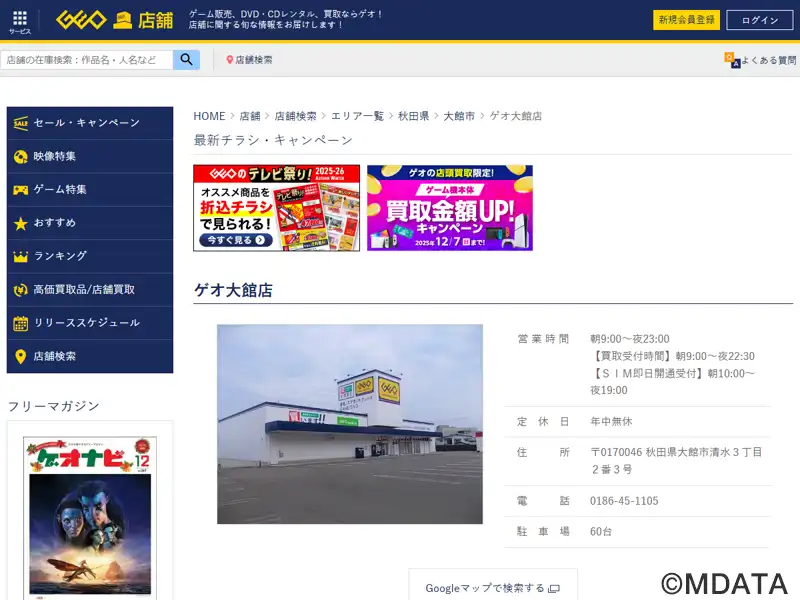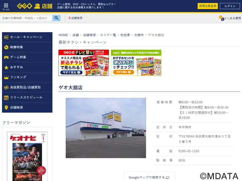 秋田県大館市にあるレンタル・販売・買取を行うアミューズメント・メディアショップ。DVD・ブルーレイ、CD、コミックのレンタル、新品・中古ゲームの販売買取、中古パソコンの販売買取、トレーディングカードの販売、スマートフォンやAV機器、家電アクセサリーも取扱う。どこよりも安くをモットーに幅広い客層に向けて、ポケットマネーで楽しめるアミューズメントソフトを提供している。秋田看護福祉大学近く、駐車場60台あり。