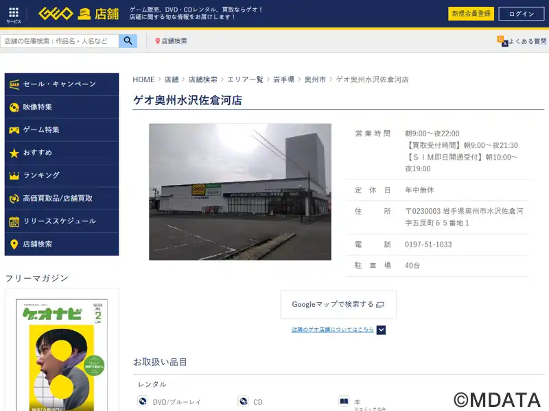 岩手県奥州市、国道4号線沿いにあるレンタル・販売・買取ショップ。DVD・ブルーレイ、CD、コミックのレンタル、新品・中古ゲームの販売買取のほか、トレーディングカードの販売、スマートフォンやAV機器、家電アクセサリー、パソコン、リユース商品、古着なども幅広く取扱う。旧作はもちろん新作・準新作も格安レンタル。幅広い客層に向けて、ポケットマネーで気軽に楽しめるエンターテインメントを提供する。駐車場40台。