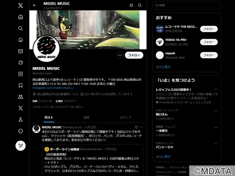 旧グリーンハウス岡山店。2022年4月より屋号をMEDEL MUSICに改称。老舗レコードショップ・グリーンハウスの岡山支店として開業。2021年2月28日より問屋町から奉還町商店街に店舗移転オープン。ヒップホップ、R&B、レゲエ、クラブジャズ、ハウスなどクラブ系ミュージックからロック、Jインディー、ポップなど幅広く、中古&新譜CD・アナログともに充実。全国ゲストショップのアナログフェアも開催。