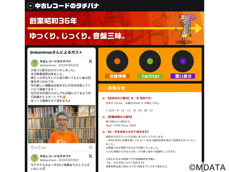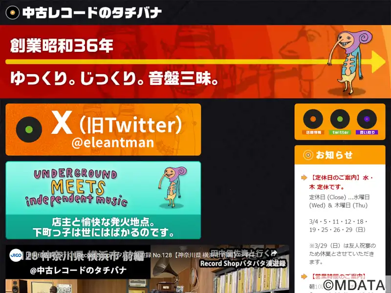 1961年に創業、なつかしくて新しいレコード文化の愉しみを提案する横浜の中古レコード店。2012年に六角橋から鴨志田に移転リニューアル。アナログ盤を中心に、人生を豊かにするオールジャンル約30,000点を常時在庫。今日も「ゆっくり、じっくり」音盤探検Around the World。オリジナルアイデア商品「廃棄レコードdeトレイ」も好評。1Fフラメシにて蓄音器コンサートを開催。