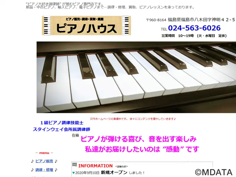 1級ピアノ調律技能士が営むピアノ専門店。2020年9月「ピアノハウス福島」として新規オープン(旧フロイデピアノプラザ福島店)。ピアノ調律・修理をはじめ、ヤマハ、カワイ等の国産グランドピアノ・アップライトピアノ、輸入ピアノから電子ピアノまで幅広く展示販売。ピアノ買取・運搬等のピアノ関連サービス、子どもから大人まで個人レッスン制のピアノ教室を行っています。