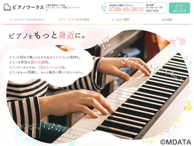 兵庫県西宮市を拠点に、アップライトピアノを中心としたレンタルおよび販売サービスを展開するピアノ専門店。中古ピアノの買取や販売をはじめ、調律、クリーニング、リニューアルなど幅広いサービスを提供し、グランドピアノや椅子、各種アクセサリー類も豊富に取り扱う。イベントやコンサート、結婚式、写真・映像撮影など多様な用途に応じて、最短1日からのレンタルが可能で、配送・設置・調律まで一貫してサポートしている。
