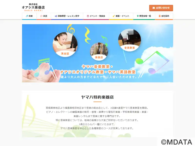 2011年2月に新築移転オープン。創業以来、音楽で人の心を豊かにするオアシスとなるべく、楽器・楽譜の販売、修理・メンテナンス、楽器レンタル、音楽教室などトータルなサービスを提供。ヤマハ特約店。「亘理センター」ではヤマハのグループレッスン、ピアノ・エレクトーン個人レッスン、ソルフェージュ等、はじめての方、子どもから大人まで、いつからでも始められます。専用駐車場8台あり。