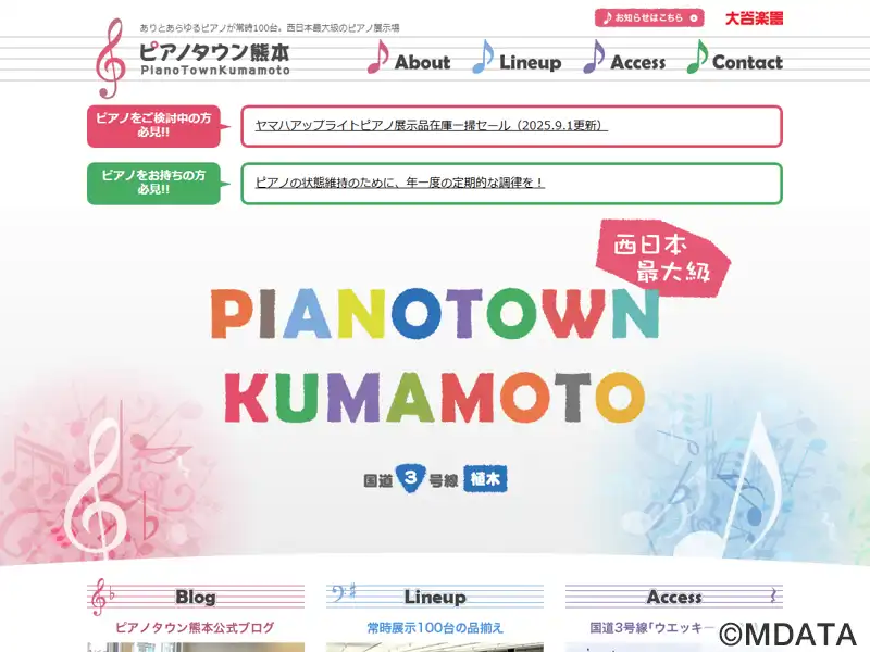 熊本県熊本市にある、常時約100台ものピアノを展示する大型ピアノ展示場。グランドピアノ、アップライト、木目調ピアノなど、各メーカーの新品からリニューアル品、中古、ハイブリッドピアノまで幅広いラインナップをそろえている。特にヤマハの新型全機種を網羅しており、台ごとに異なる音やタッチを弾き比べて選ぶことができる。専門スタッフによるきめ細かなサポートで、初めての方でも安心して利用できる環境となっている。