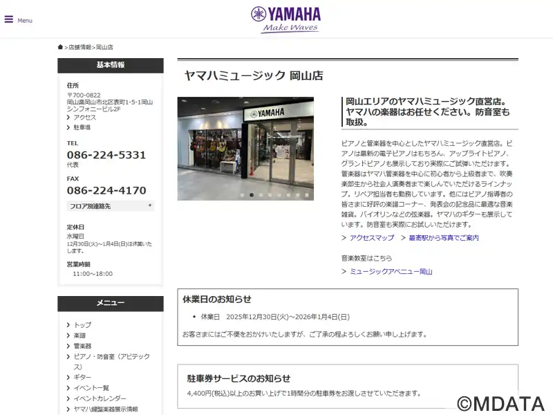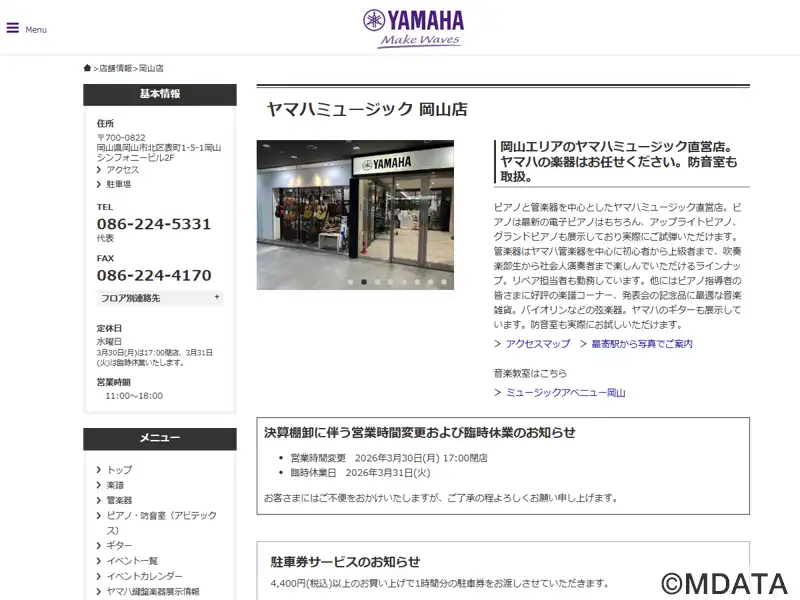 岡山市北区に位置し、城下駅からすぐ目の前の岡山シンフォニービル2Fにある、ヤマハの総合楽器店の岡山店。アップライトピアノ、グランドピアノ、電子ピアノ、管楽器、バイオリンなどの弦楽器、ギターなど、初心者から上級者用まで、ヤマハ製の楽器を中心に多数の在庫を取り揃えている。また楽譜やアクセサリーも豊富に揃っている。楽器は試奏が可能であり、リペア担当者が在籍している。ヤマハ防音室アビテックスも体験できる。